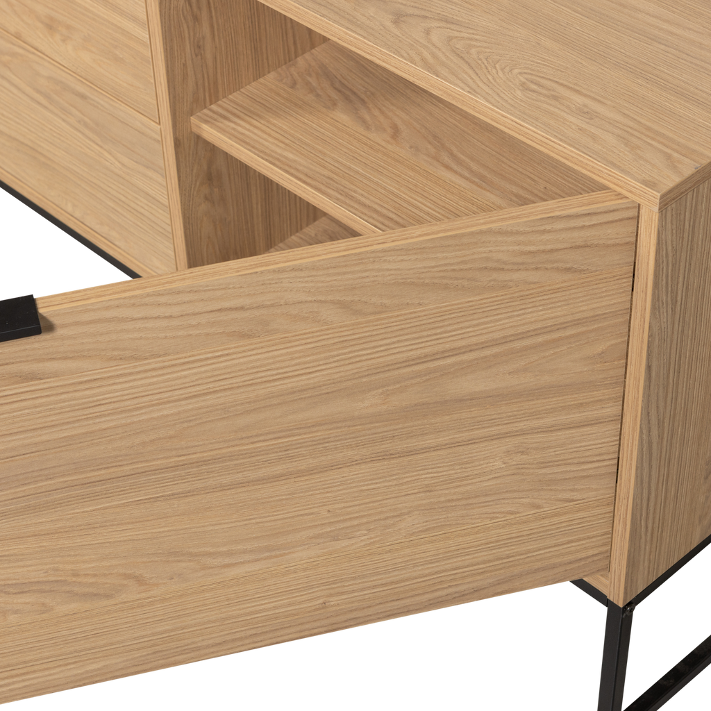 Stilren och funktionell TV-bänk i ekmelamin med svarta metallben. Perfekt för stora TV-apparater.