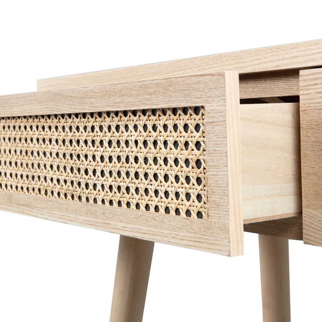 Elegant skrivbord i skandinavisk stil med spegel och rottingdetaljer. Perfekt för små utrymmen med praktiska förvaringslådor.