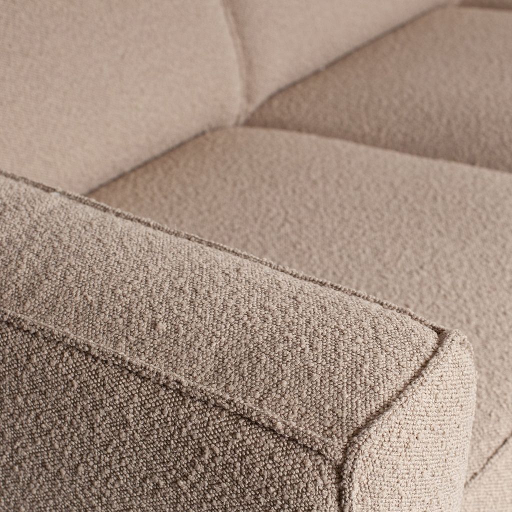 Soffan är klädd i en mjuk boucle-tyg gjord av 100% polyester, vilket ger en trendig och elegant textur. Tygets täta vävning, med en Martindale på 100,000, säkerställer att soffan tål intensiv användning utan att slitas eller rivas. Den beige färgen är tidlös och passar in i de flesta inredningar.