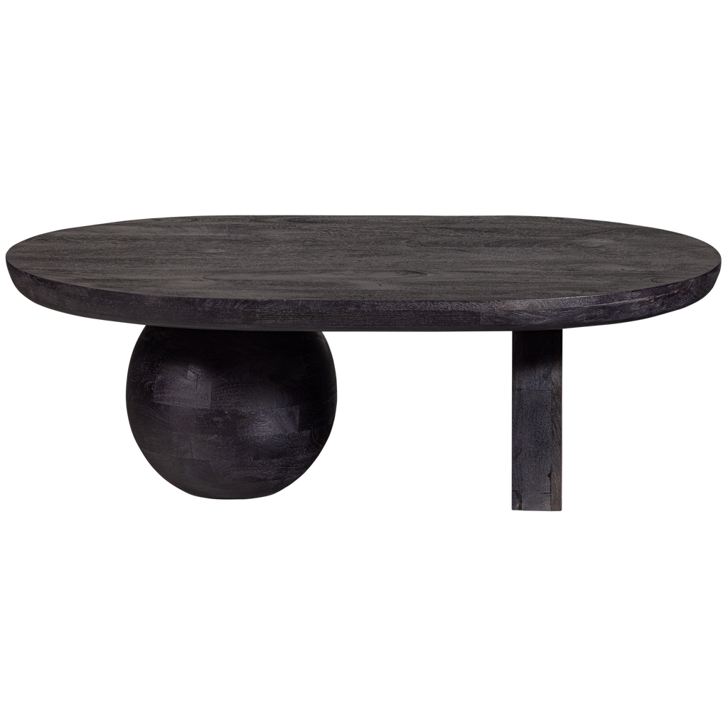 Elegant soffbord i matt svart mangoträ med unik afrikansk stil, perfekt för moderna interiörer.