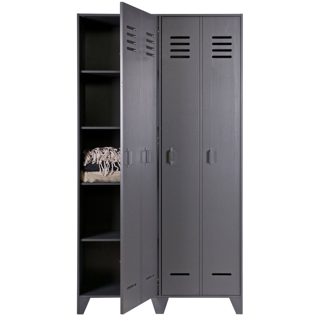 Upptäck den robusta och stilrena WOOOD STIJN HÖG 2-dörrs lådskåp, perfekt för både hem och kontor. Tillverkad av hållbart furu med en elegant stålfärgad finish, erbjuder denna möbel en modern touch med en industriell känsla.