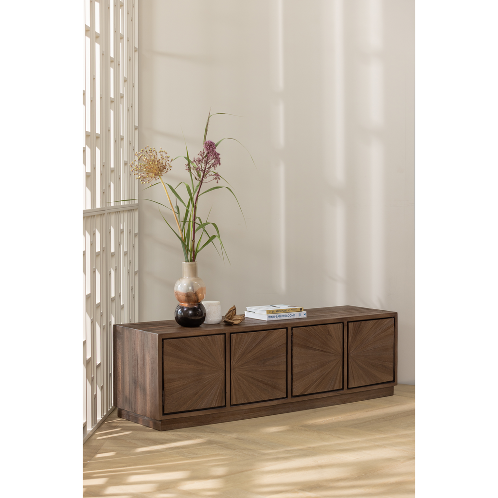 Den WOOOD SUN TV-bänken är en perfekt kombination av stil och funktion, tillverkad av högkvalitativt återvunnet teak. Med sin eleganta bruna färg och intrikata detaljer på dörrarna, adderar den en unik, hantverksmässig känsla som passar perfekt i moderna hem.
