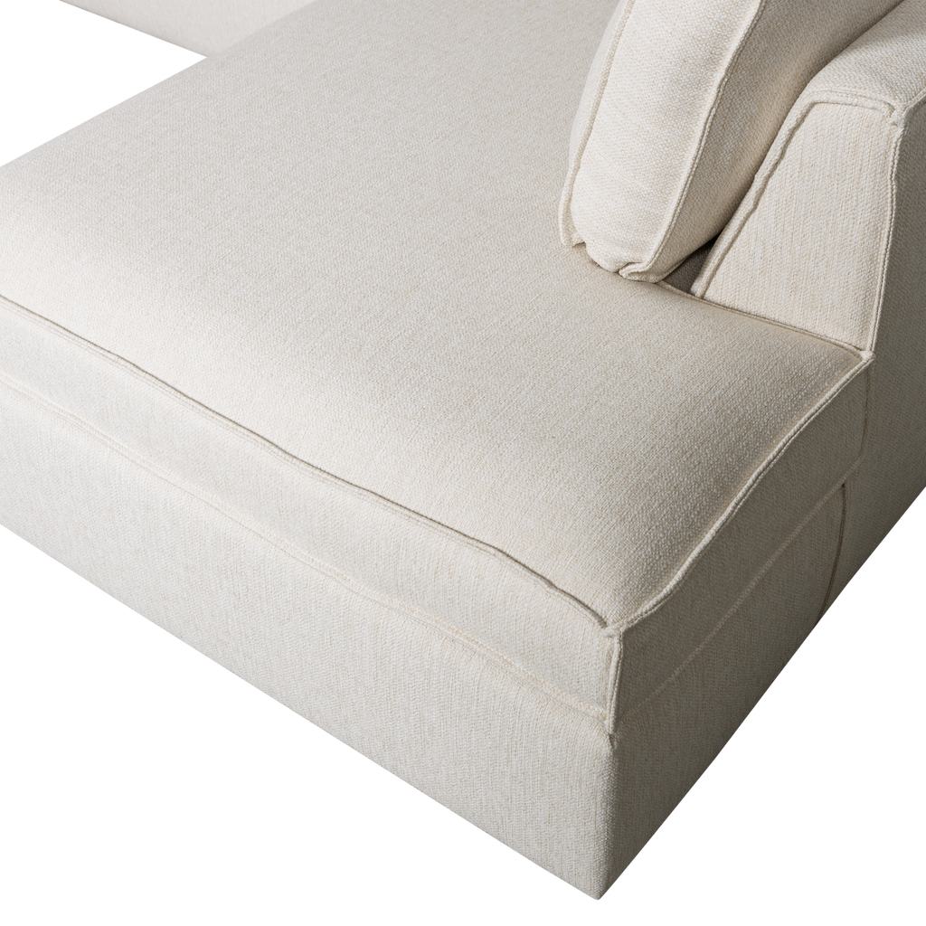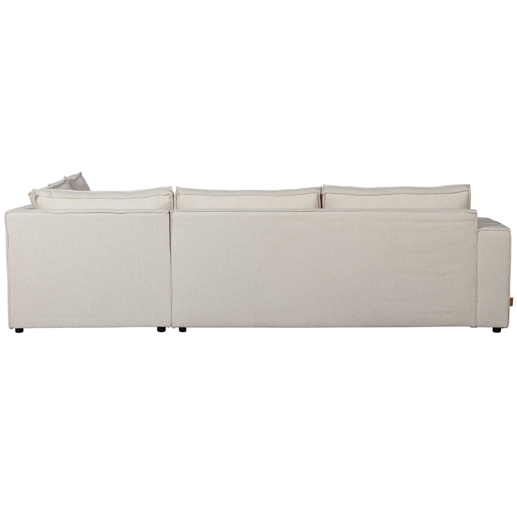 Tidlös hörnsoffa i sandfärgad väv, erbjuder generös komfort och anpassbar design för moderna hem.