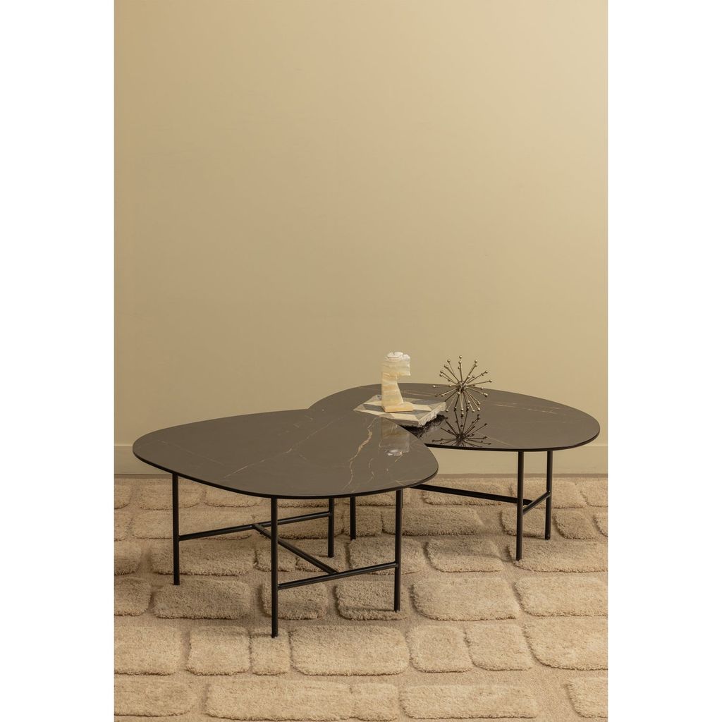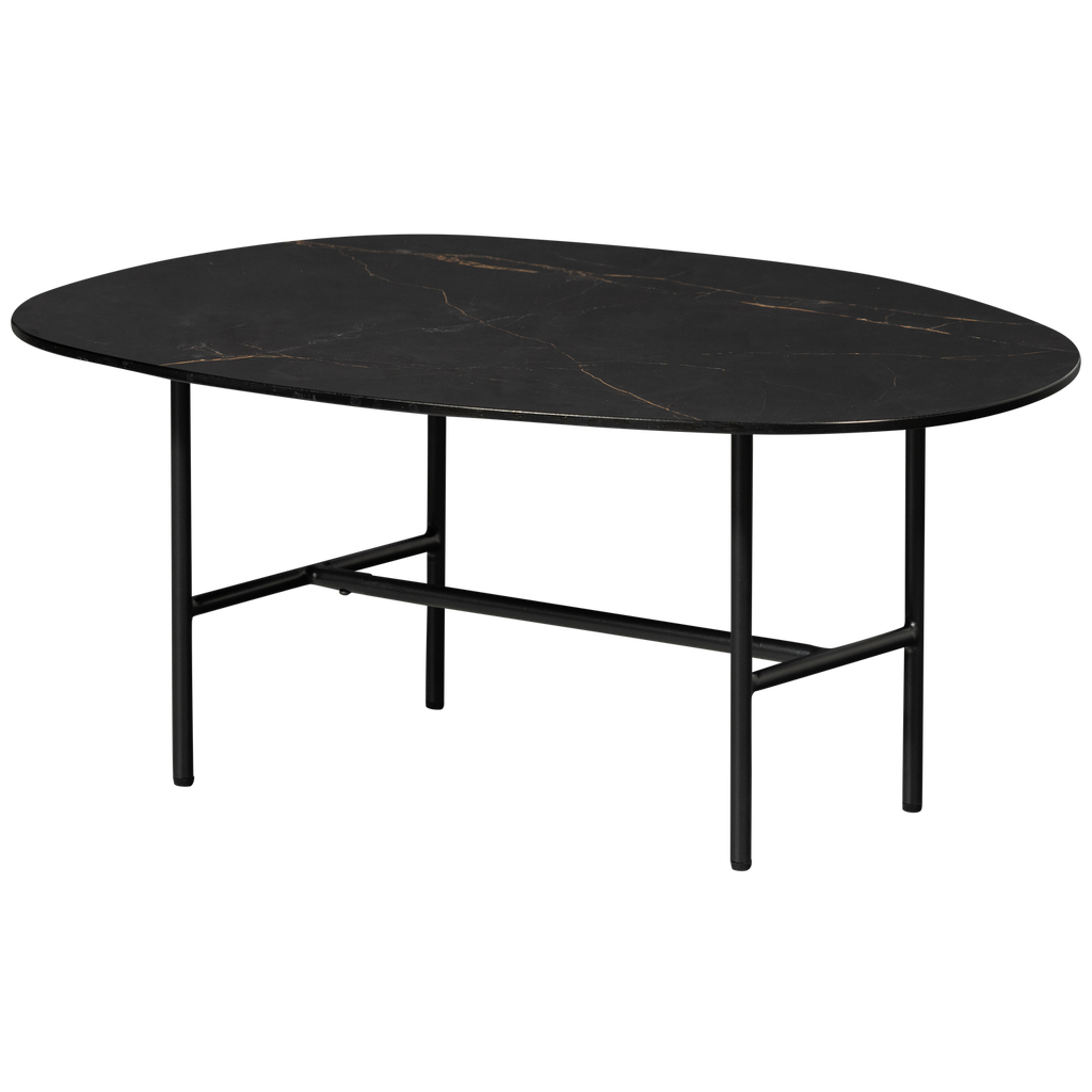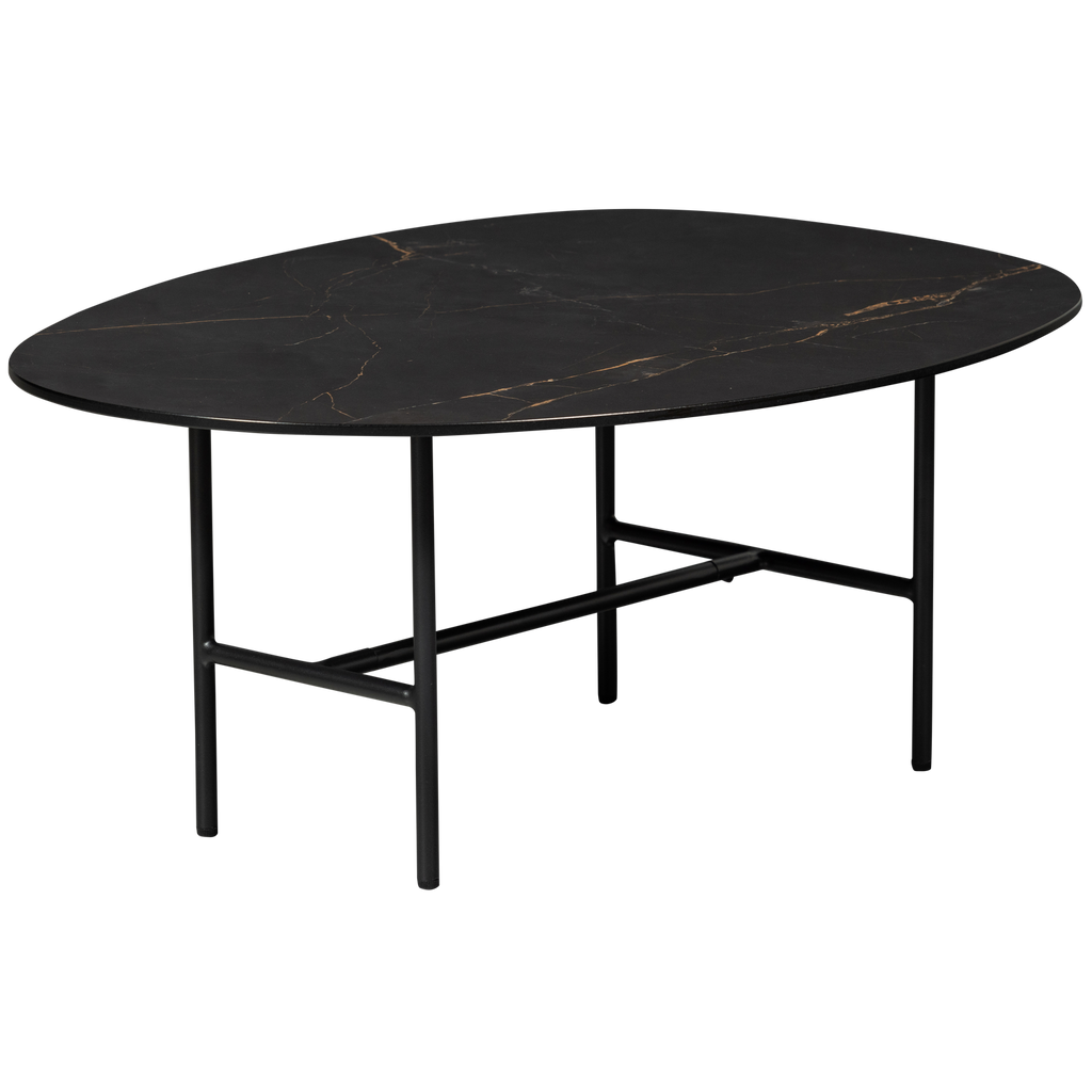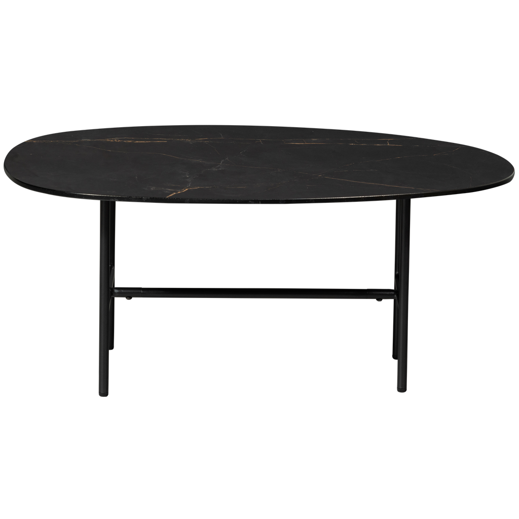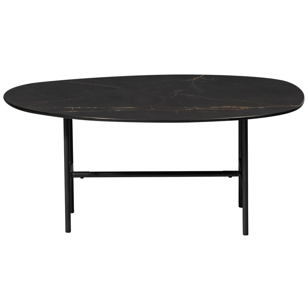 Detta soffbord har en stabil metallram med slanka linjer som förstärker bordets eleganta utseende. Bordsskivan är tillverkad av porcelan och erbjuder både skönhet och hållbarhet. Porcelanens glansiga yta ger en extra skyddande lager och en iögonfallande finish.