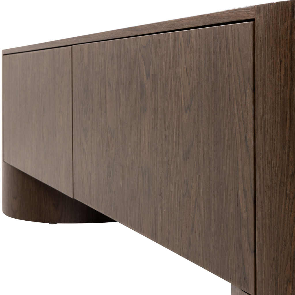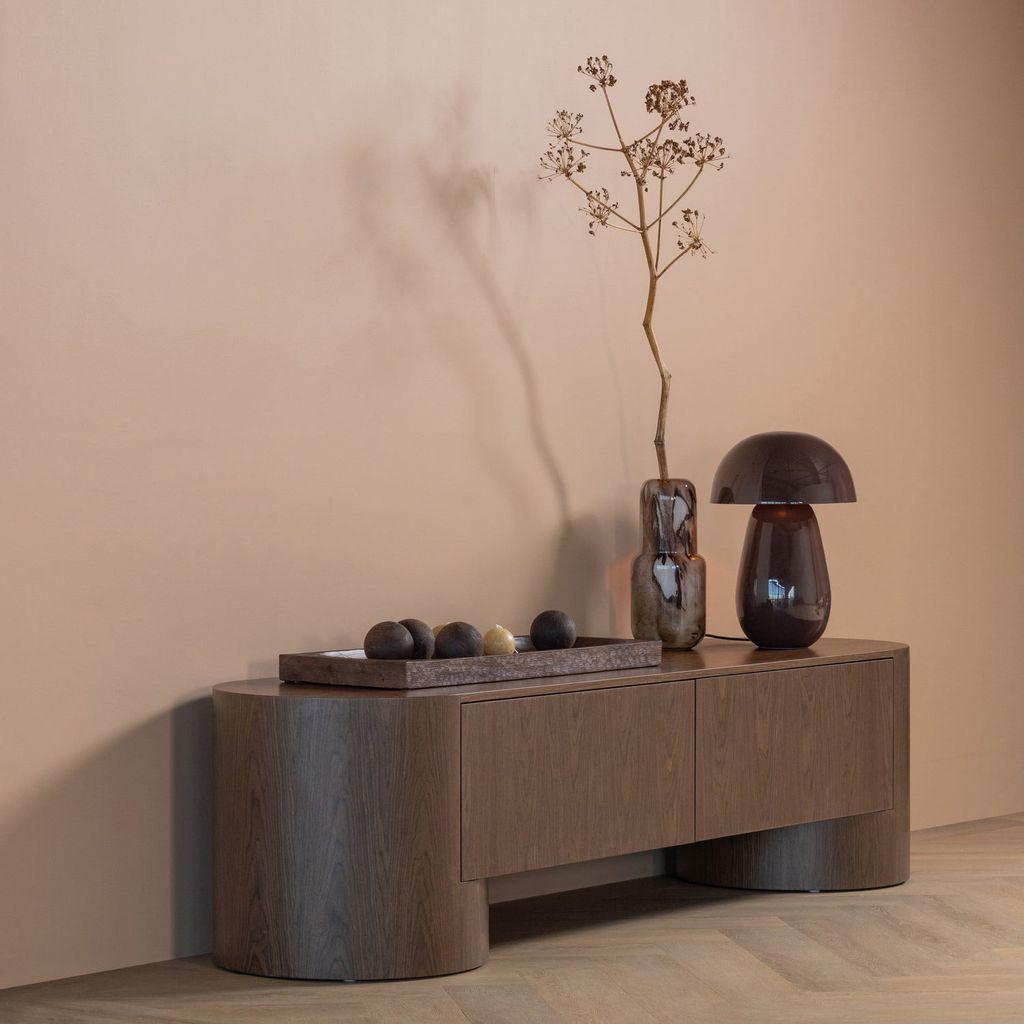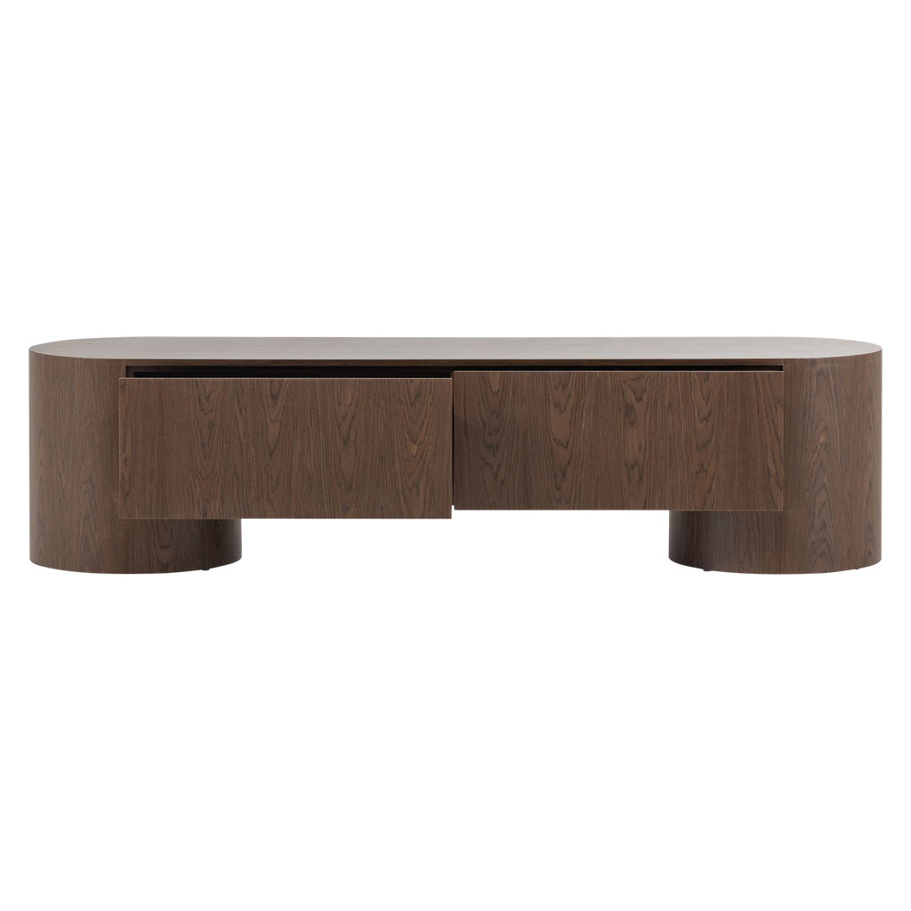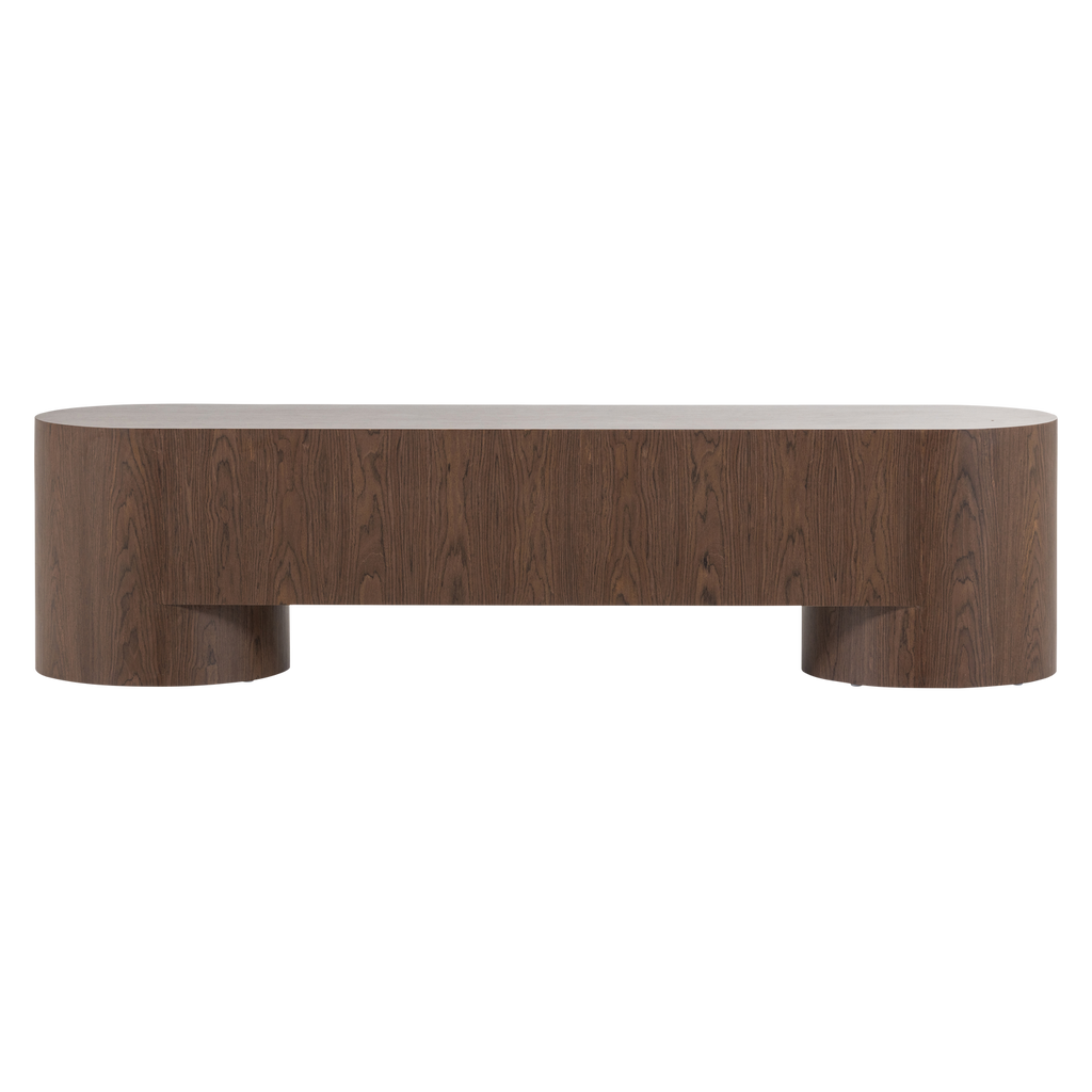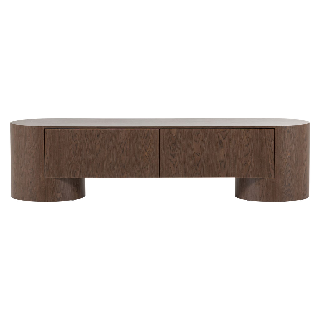 Ge ditt vardagsrum ett stilfullt lyft med WOOOD VELARI TV-bänk, ett perfekt exempel på elegant och funktionell design. Tillverkad av hållbar brun träfanér, utstrålar bänken en naturlig värme med sina tydliga och vackra träådringar. Den mjukt rundade formen gör att den harmoniskt smälter in i både moderna och traditionella inredningar.