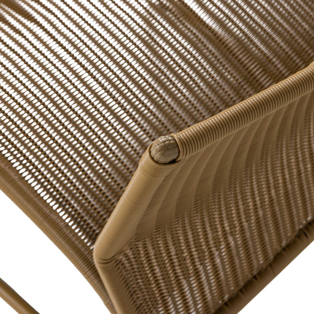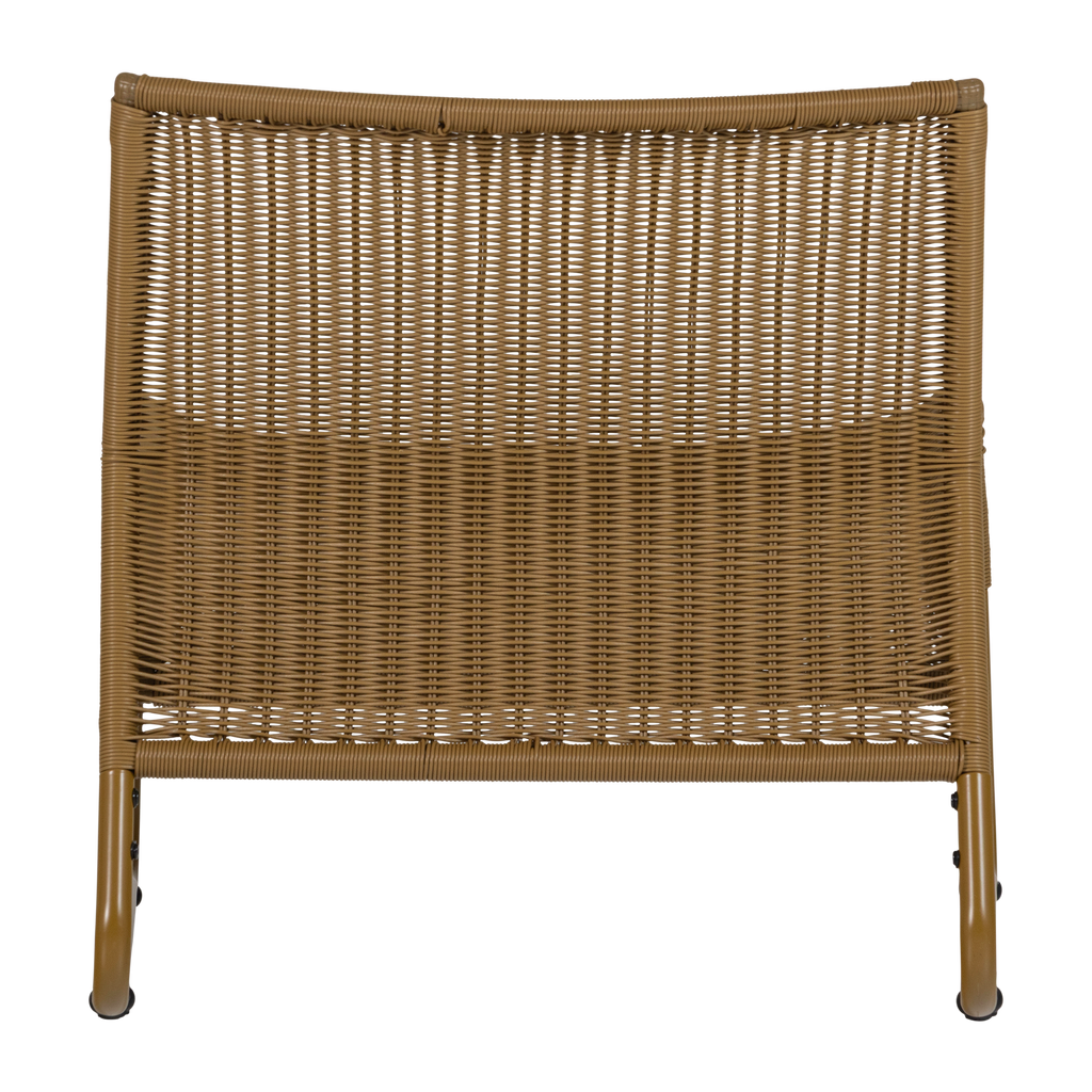 Stilren och bekväm loungestol i honungsgul färg, perfekt för både inomhus- och utomhusbruk.