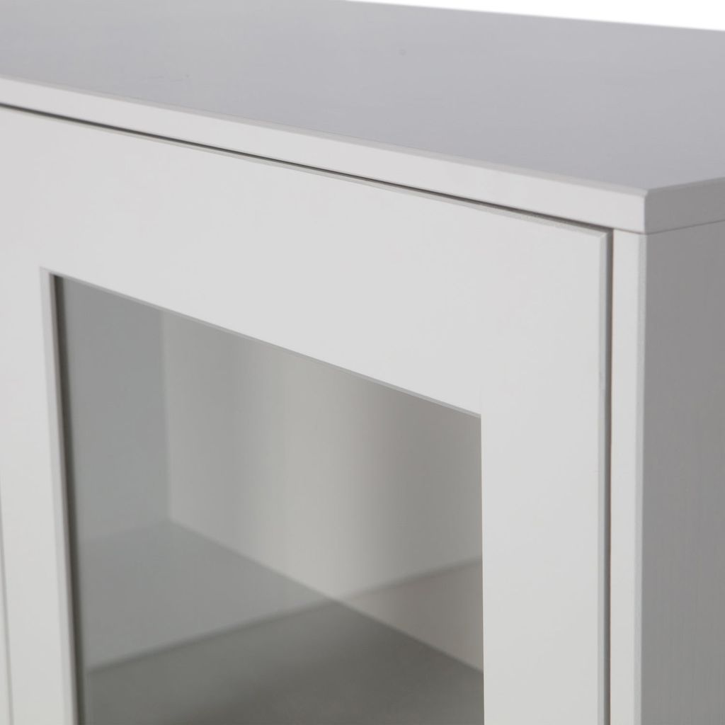 Skydda dina golv genom att fästa filtglidare under benen och skapa en elegant och organiserad atmosfär i ditt hem med detta tidlösa vitrinskåp.