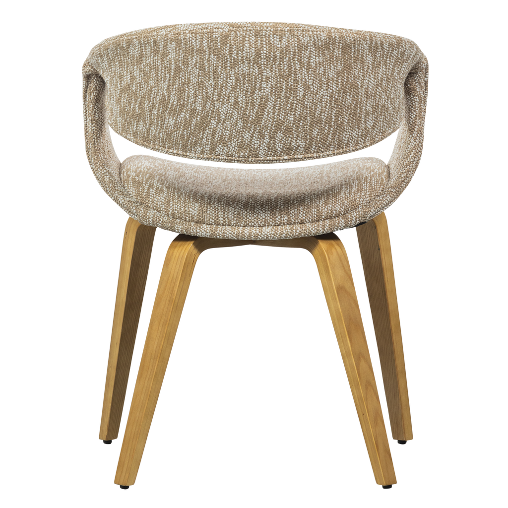 Den eleganta designen har en subtil vävd textur som ger en lyxig känsla. De sandfärgade tonerna kompletterar enkelt olika inredningsstilar, medan den unika finishen runt armstöden ger en extra touch av elegans. Placerad på fyra robusta träben, erbjuder stolen både stabilitet och stil.