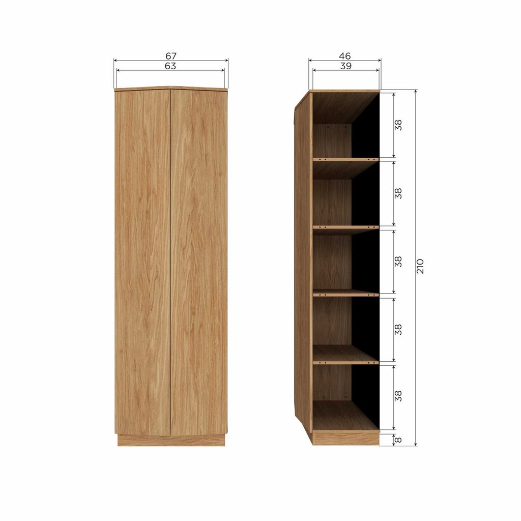 Skåpet mäter H 210 cm x B 67 cm x D 46 cm och erbjuder generöst lagringsutrymme bakom sina två dörrar, vilket gör det idealiskt för att organisera och förvara dina ägodelar. Ekträets synliga ådring och knutar ger varje skåp en unik karaktär och förstärker dess autentiska utseende.