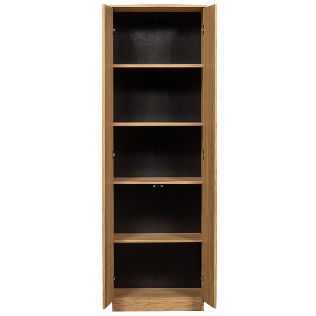 Stilrent högskåp i ekfanér med naturlig matt finish. Perfekt för organiserad förvaring i hemmet.